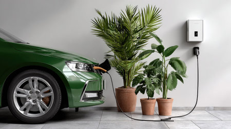 A vibrant green electric car is charging at a sleek wall-mounted station next to potted indoor plants, showcasing eco-friendly living and modern technology.