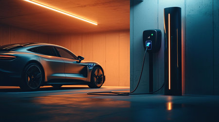 This image showcases a generic electric vehicle EV hybrid car being charged from a wallbox in a sleek, contemporary modern environment. The scene highlights the growing trend of sustainable transportation and innovative charging solutions.