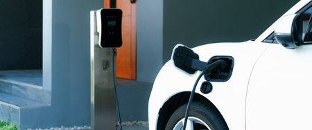 Electric vehicle technology utilized to residential area or home charging station for EV car battery recharge. Eco-friendly transport by clean and sustainable energy for future environment. Synchronos