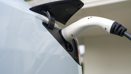 Close up view of vehicle electric charging socket plug in to recharge in Bangkok, Thailand.
