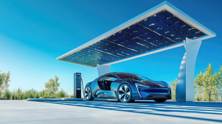 A futuristic electric car charging under a solar-powered station, clear blue skies above. Sustainable and modern setting.