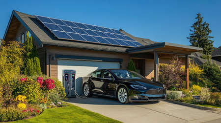 An electric vehicle charging at a residential home garage with solar panels on the roof, emphasizing sustainability and clean energy.