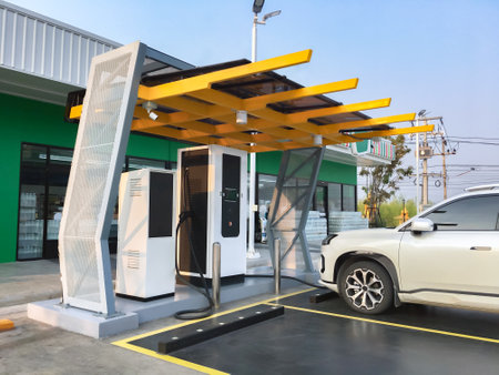 White solar panels on an electric charging station, providing renewable power for electric vehicles.