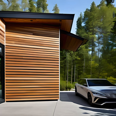 Luxury electric car charging in the driveway of a contemporary home, featuring a blend of glass and wood materials. The low-angle view highlights the sleek design of both the car and the modern architecture as dawn light accentuates the clean lines and open-concept style.