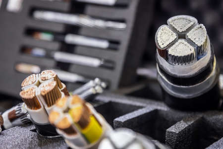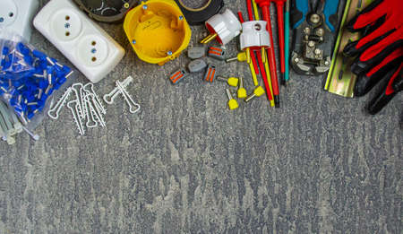Electrical tools and a set of components for use in electrical installations on a gray background with a place for text