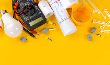 Different electrician's supplies on yellow background. Background of professional electrician tools with space for text