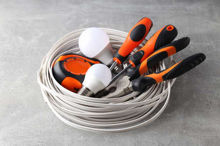 Flat lay composition with electrician's tools and space for text on gray concrete background