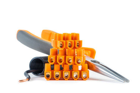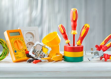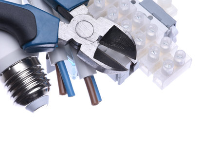 Close-up of work tools and electrical equipment on a white background with space for text / announcement.