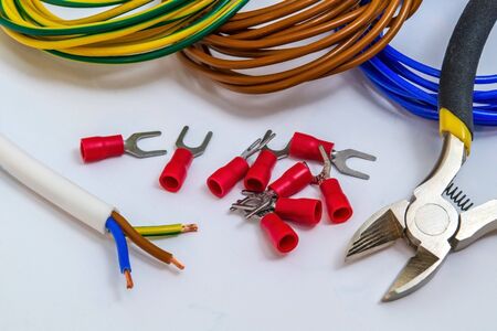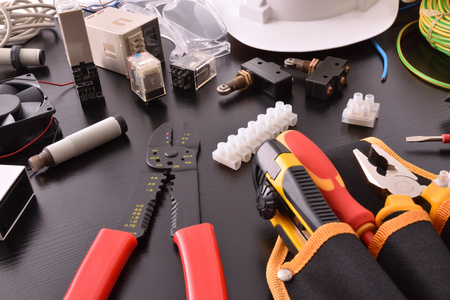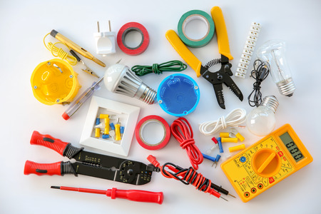 Tools and electrical material on a white table space above. Horizontal composition. Top view.