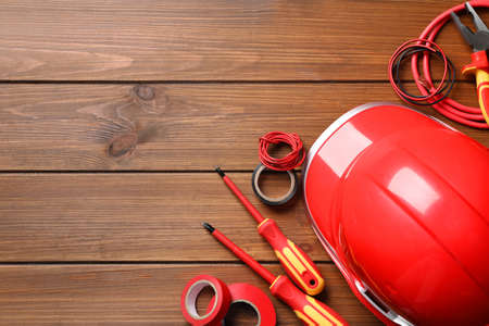 Flat lay composition with electrician's tools and accessories on wooden background, space for text