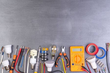 Spare parts, tool and wires for replacement or repair of electrical equipment on gray background