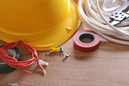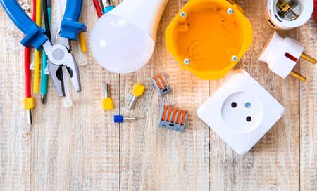 Set of electrical tool on wooden background. Accessories for engineering work, energy concept