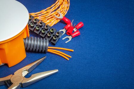 Kit spare parts and tools, wires for electrical prepared before repair or setting on a blue background