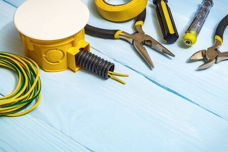 Close-up of work tools for residential electrical installation on an antique wooden table with space for text / announcement