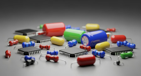 Assorted colorful electronic components, including resistors, capacitors, and microchips, scattered on a grey surface. represents technology, engineering, and circuit design.