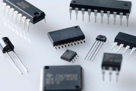 Old chips on a white background. Electronic components. Processors in metal and plastic cases.