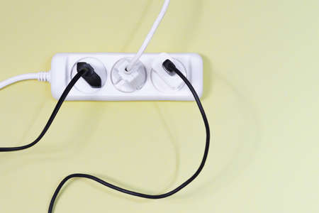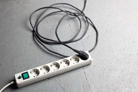Electrical plugs with cords connected to electrical power strip, electrical extension for appliances with On-Off switch.Concept of energy saving, network congestion.