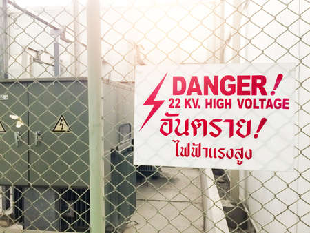 Warning danger high voltage sign and thai language mean danger high voltage also. A big red. 22 KV. high voltage.