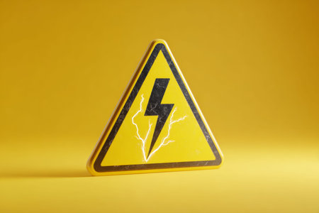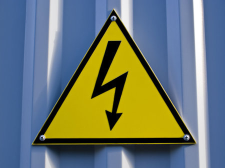 A bright yellow sign with a lightning bolt warns of electrical hazards.