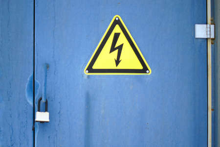 Locked electric old metal door with attention sign on the blue wall of transformer substation. Closed overhead lock and high voltage sign.