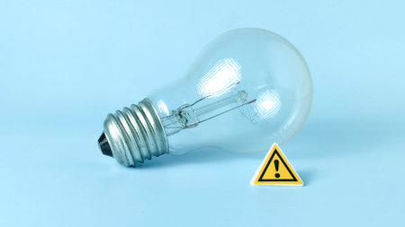 Incandescent Light Bulb Next to Caution Sign on Blue Background Representing Idea, Danger, and Energy