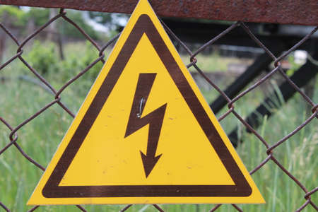 Electronic, high voltage, warning sign, yellow triangle with lightning on a fence made of metal mesh.