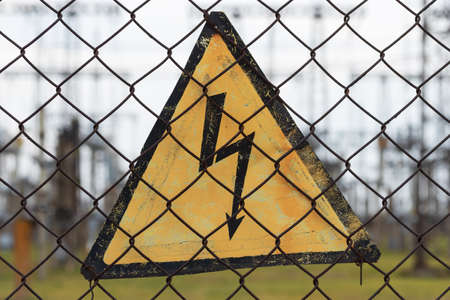 Danger sign high voltage on a mesh wire fence in front of substation