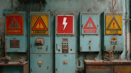 A weathered warning sign indicating high voltage hazards is mounted on a grungy wall. The surrounding electrical cables enhance the industrial atmosphere, emphasizing safety.