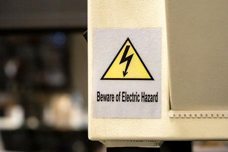 Beware of electric hazard sticker warning label on a generic industrial factory production line machine. Electricity, high voltage, shock danger, workplace occupational safety, simple concept, nobody