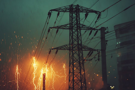 An imposing power tower stands amidst a dramatic scene as lightning strikes. The image showcases electric arcs against a dark sky. The composition highlights the structure's framework. This imagery could be employed for editorial articles or as part of a technological or environmental theme.