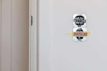 one socket and open bare rosette sealed with masking tape with the inscription danger installed in the white wall and the door at the left side. dangerous electricity