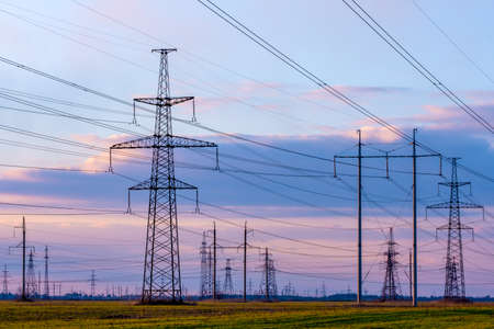 High-voltage power lines on the background of the evening sky. Transmission of electricity by means of poles through agricultural land. high quality photo