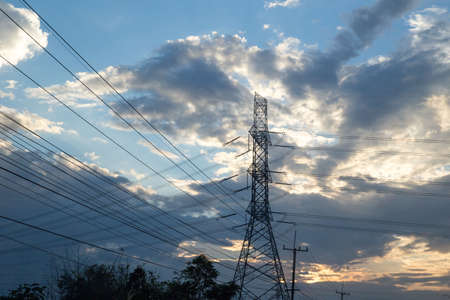 high voltage post,High voltage tower sky sunset background.