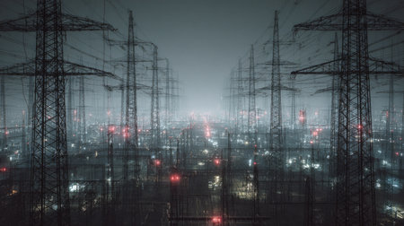 A captivating nighttime urban landscape featuring intricate power lines and electric towers, surrounded by glowing city lights, creating a mysterious and atmospheric scene.