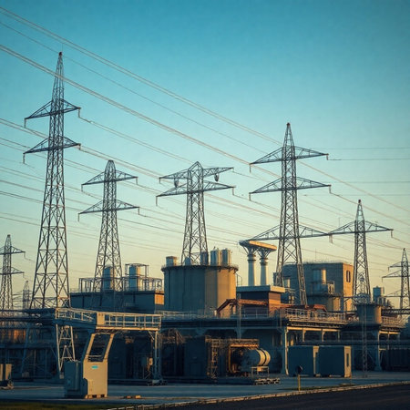 Captivating image of a modern industrial power station showcasing high voltage equipment under a cloudy sky, emphasizing energy infrastructure and urban technology.