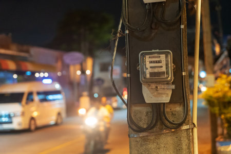 A close-up view of an electric meter mounted on a post in a bustling city street at night, with vehicles passing, showcasing urban energy infrastructure.