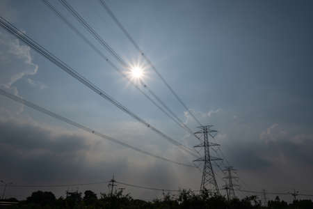 High voltage electricity pole on bright sky clouds background, electricity transmission pylon, Power distribution