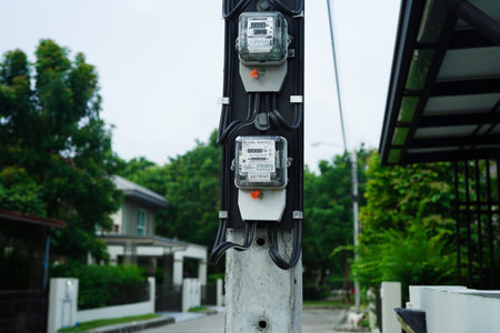 Electric meter installed on the pole to measurement watt in the house. Shooting in morning time with sunlight effect
