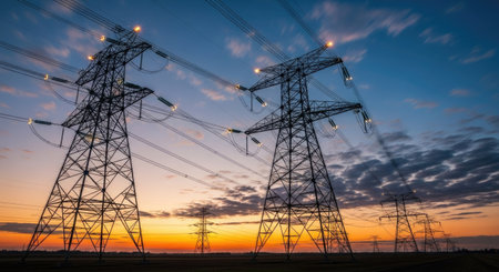 Amidst a dusky skyline, towering electrical pylons rise, silhouetted against vibrant hues of blue and orange. Bright city lights twinkle in the background as vehicles glide by.