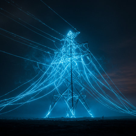 A glowing electricity pylon with high-voltage cables during twilight, surrounded by mist and lights