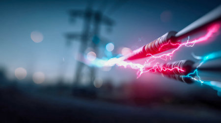 Close-up of sparks flying from an exposed wire, capturing the moment of electrical discharge in vivid, high-energy detail