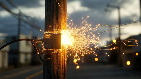 A captivating image capturing a vibrant spark of electricity bursting from an electrical connection on a utility pole, illustrating energy and potential danger in an urban setting.