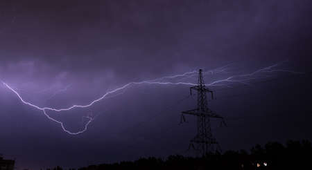 Lone electricity pylon is standing tall as lightning is striking in the background during a dramatic storm
