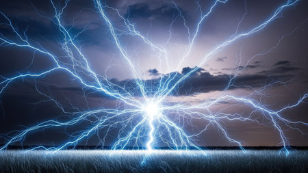 Powerful bolts of blue lightning illuminate a dark, cloudy sky. The dramatic image showcases a network of electrical discharges emanating from a central point. The visual style features bright, energetic colors and striking contrast, suitable for conceptual or illustrative purposes. It conveys power and natural phenomena.