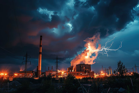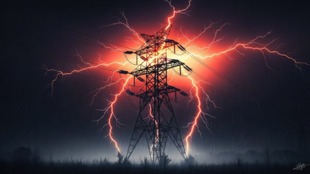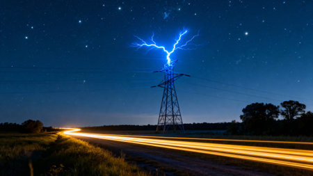 A striking nighttime image captures a powerful lightning strike illuminating power lines. The scene presents dark blue and gray hues, with dramatic streaks of bright light. The composition features an overhead view with a focus on natural elements. This image is suitable for use in educational materials or commercial design projects.