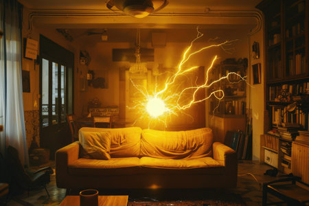 Round ball lightning years around the apartment, mysterious natural phenomenon, element, lightning during a thunderstorm
