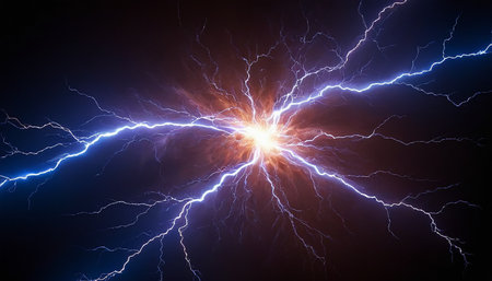 A dynamic digital illustration of intense electric blue energy radiating from a central point, resembling an electrifying explosion or a powerful electrical discharge. AI Generation