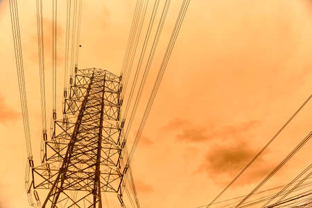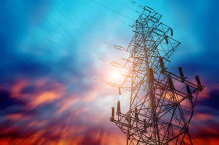 Power plant silhouette At sunset, a high-voltage tower stands against the sky. Electrical transmission wires from the bottom.