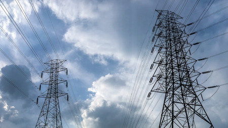 High-voltage power lines, high voltage electric transmission. High voltage electric tower line pylon for distribution of electricity from power stations to customers through national power grid.