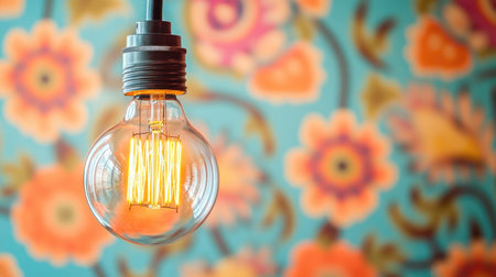 A bright vintage light bulb hangs elegantly against a warm bokeh background, creating a cozy and inviting atmosphere perfect for modern interiors.